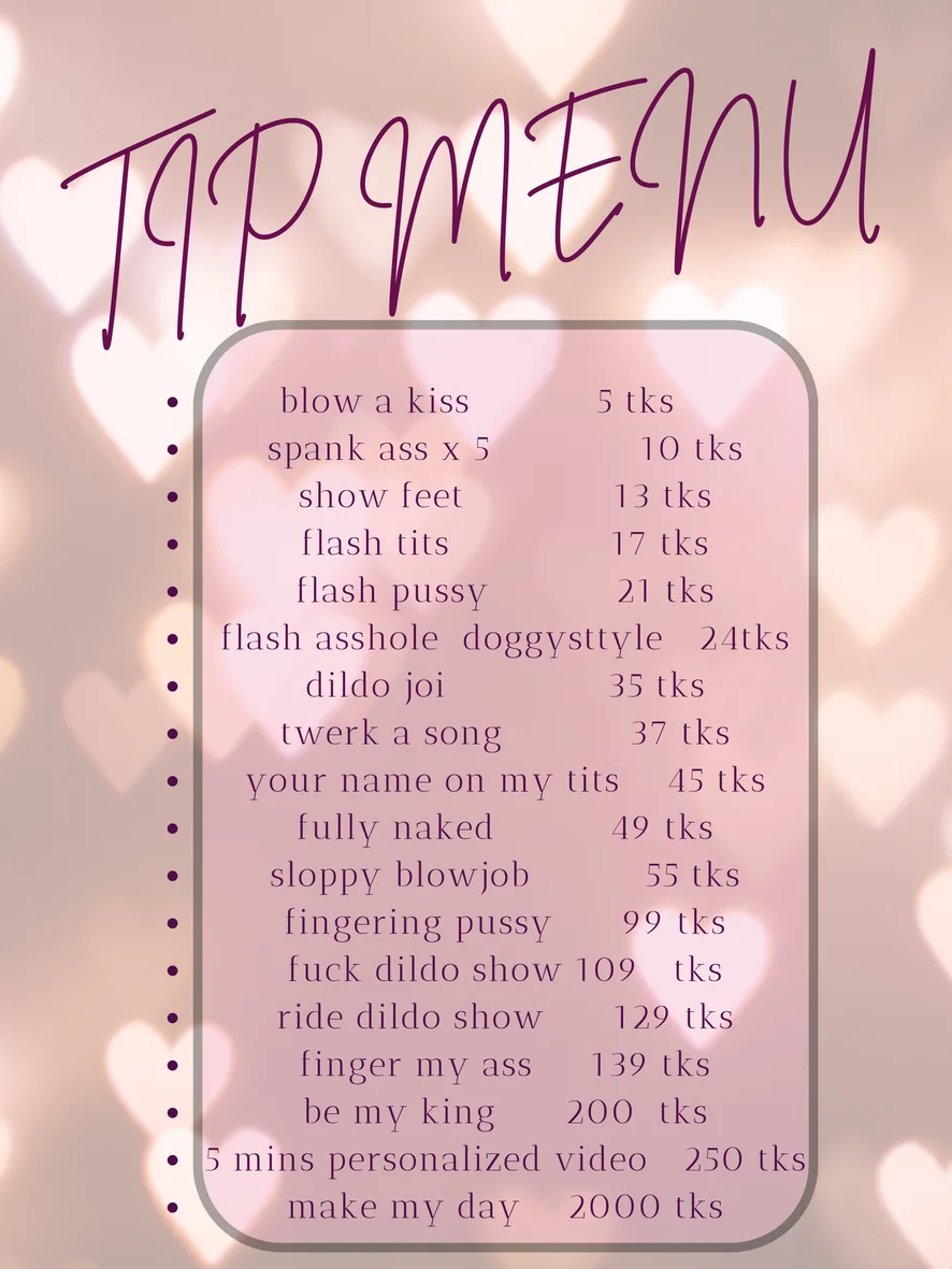 Ahegao, Erotikus tánc, Tevepata, Sztriptíz, Félmeztelen, Twerk, Kutyapóz, Ujjazás, Dildó vagy vibrátor, Mocskos beszéd, Mély torok, Megalázás, Maszturbálás, Cici baszós, Olajozás, Anál, Dupla behatolás, Anális játékok, Szexjátékok, Szopás, Spriccelés